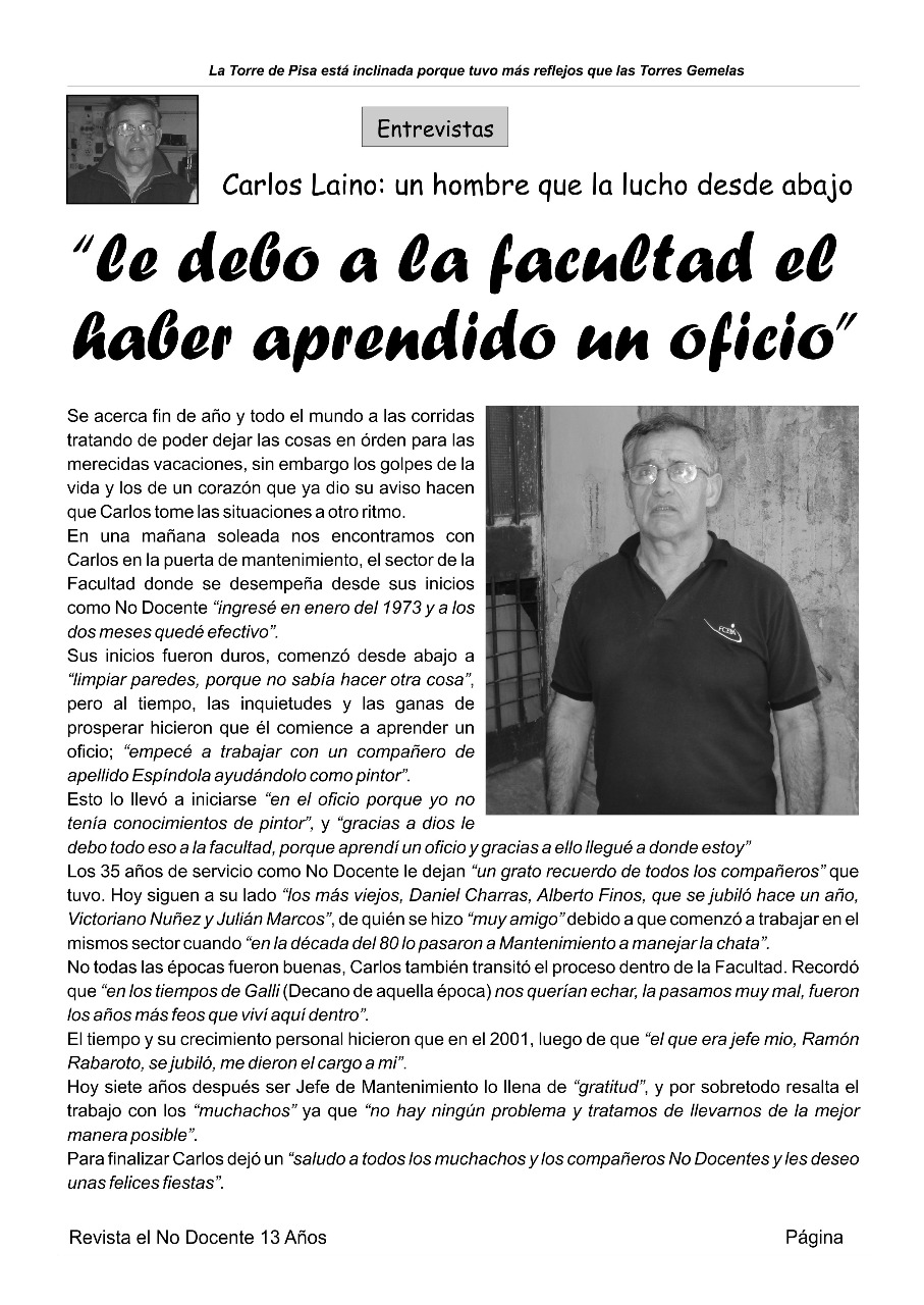 La revista El Nodocente es realizada por la comunidad nodocente de la FCEIA. En esta oportunidad, en diciembre del 2008 se entrevistó a Carlos Laino, quien relata sus comienzos en la Facultad y señala que aquí aprendió un oficio.